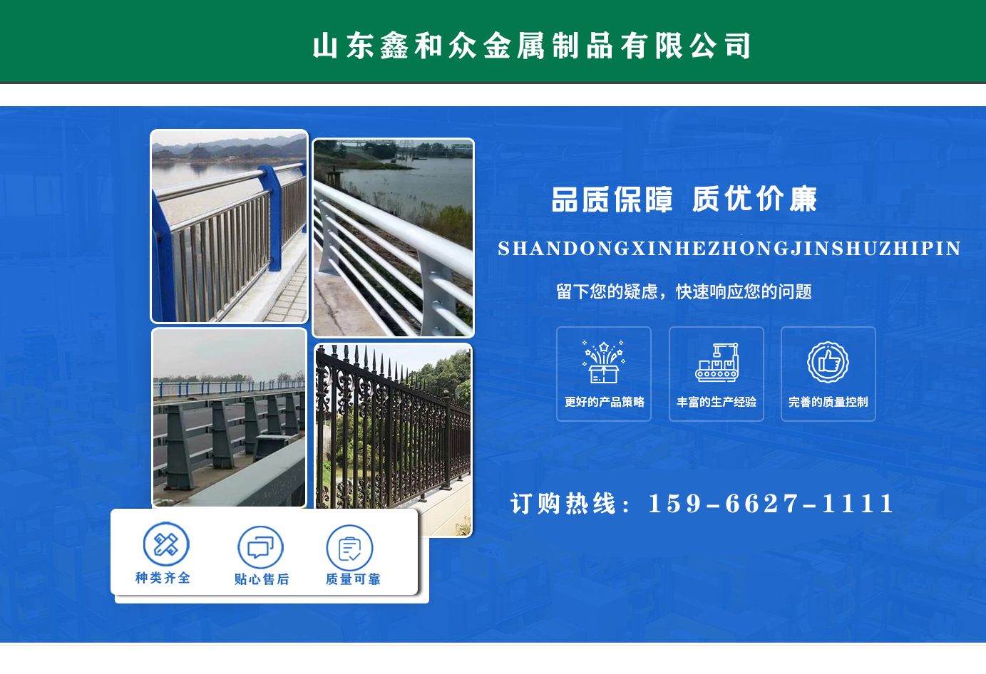 山東鑫和眾金屬制品有限公司主要產(chǎn)品有防撞護(hù)欄,橋梁護(hù)欄,道路護(hù)欄,河道護(hù)欄,不銹鋼護(hù)欄等護(hù)欄。提供設(shè)計方案,一站式定制,包您滿意價格優(yōu)惠,歡迎來電咨詢! 公司常年從事銷售護(hù)欄防撞護(hù)欄,橋梁護(hù)欄,道路護(hù)欄,河道護(hù)欄,不銹鋼護(hù)欄,橋梁鋼護(hù)欄,河道燈光護(hù)欄等。產(chǎn)品廣泛應(yīng)用于橋梁、河道、旅游景區(qū)、道路、公路、公園、小區(qū)、景觀、道路防撞等領(lǐng)域?! 」井a(chǎn)品均采用優(yōu)質(zhì)不銹鋼材料,符合相關(guān)標(biāo)準(zhǔn)。各種型號不銹鋼復(fù)合管及護(hù)欄,質(zhì)量嚴(yán)格把控。產(chǎn)品強(qiáng)度高、耐腐蝕、焊接牢固、抗沖擊、性能好,防撞護(hù)欄結(jié)構(gòu)簡單、美觀實用大方。 歡迎前來訂購!...